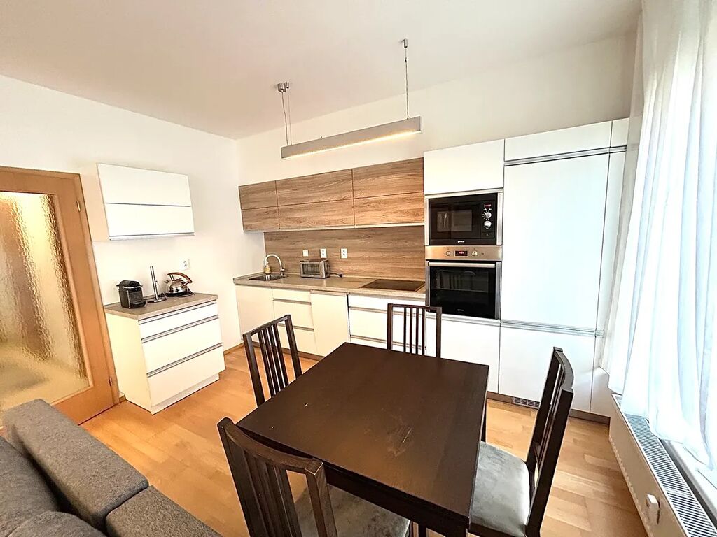 Byt je zařízený. Kuchyň je vybavená kuchyňskou linkou a elektrospotřebiči.