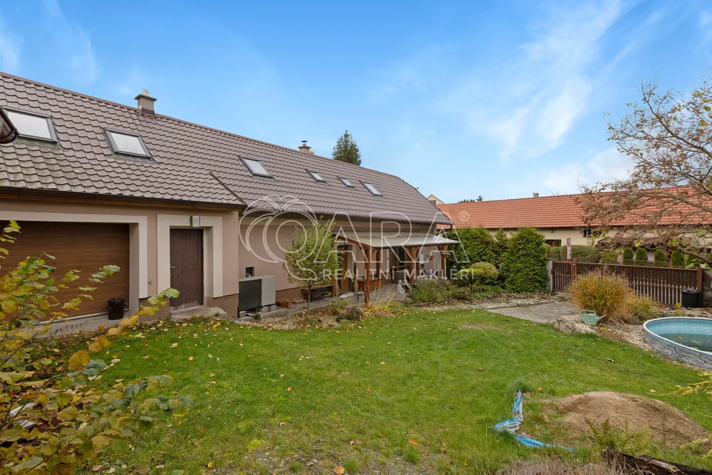 Zahrada o rozloze 975 m² disponuje pergolou, vinným sklípkem, bazénem a stodolou. Bazén má filtraci a tepelné čerpadlo, studna elektrické čerpadlo.