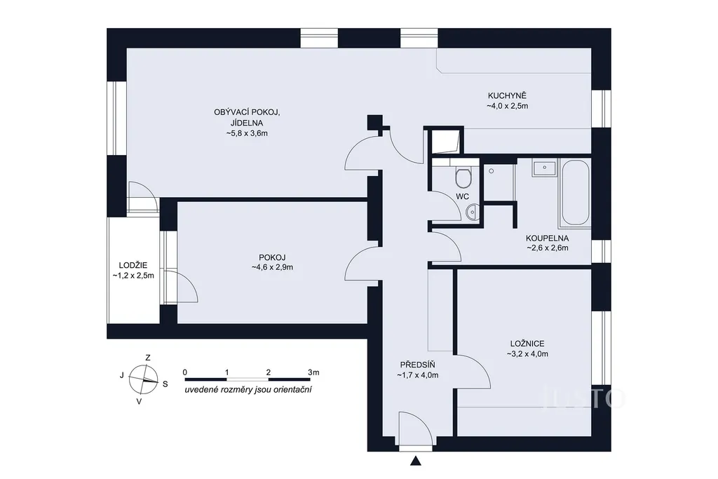 • k tomu připočtěte plochu lodžie cca 3 m² (jih)
