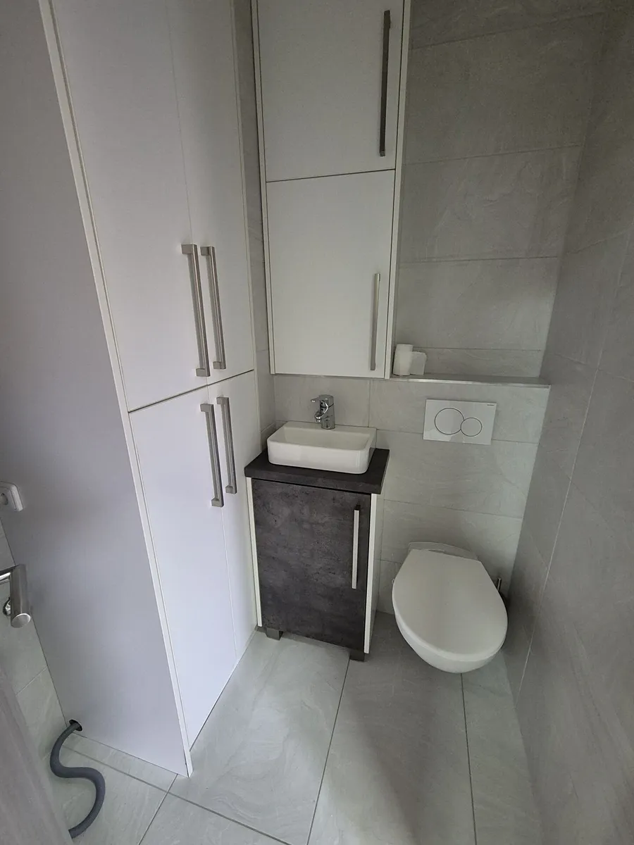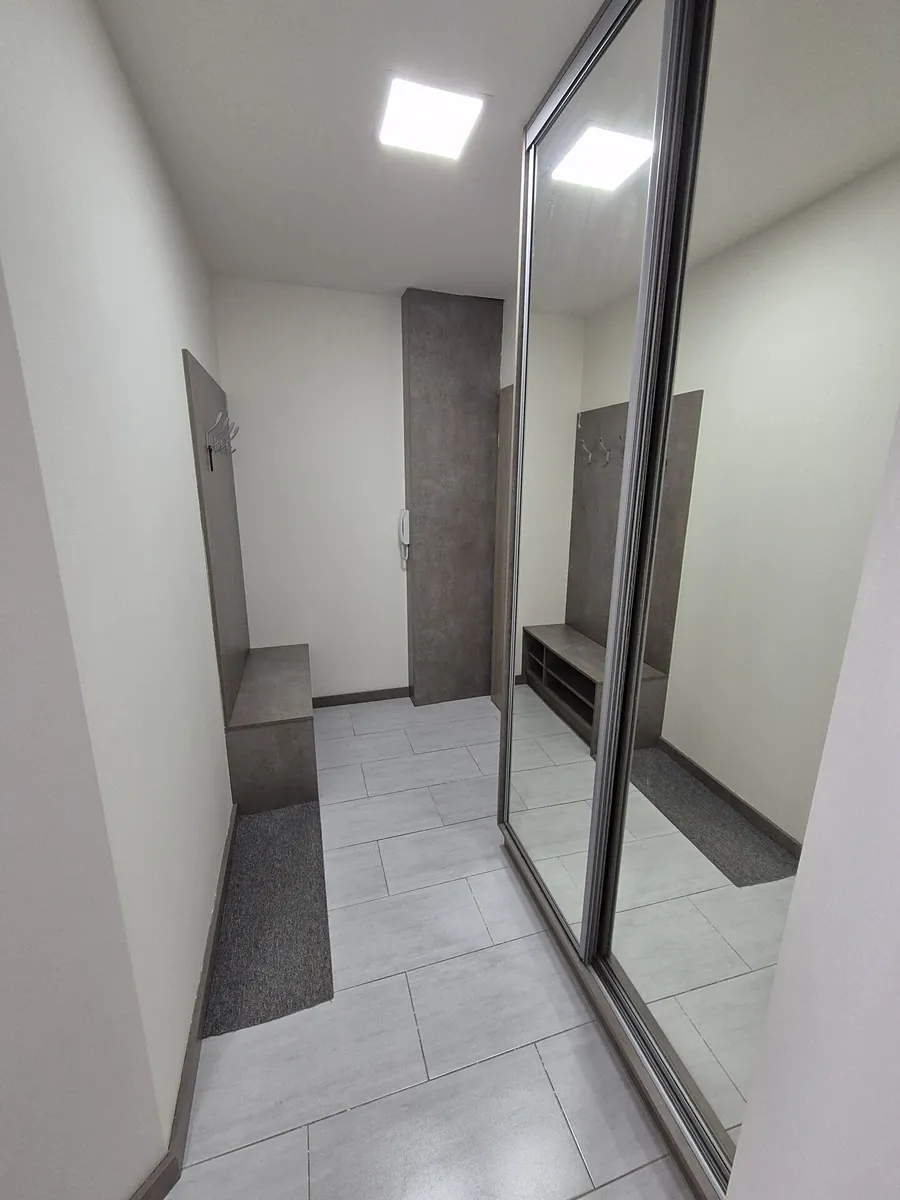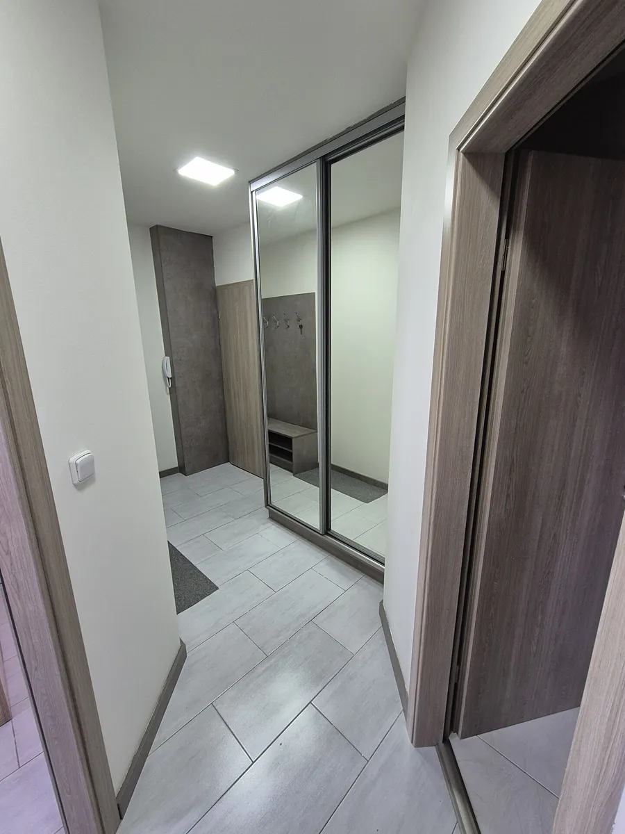 Dispozice bytu: kuchyňský kout (vybaven kuchyňskou linkou s vestavěnými spotřebiči - sklokeramickou varnou deskou, lednicí, digestoří, horkovzdušnou troubou, mikrovlnnou troubou), obývací pokoj (stolek, komoda, stůl, židle), ložnice (manželské dvoulůžko, skříně), předsíň (vestavěná skříň, botník), koupelna (koupelnová skříňka se zrcadlem, sprchový kout) a samostatné WC (skříňky, malé umyvadlo).
