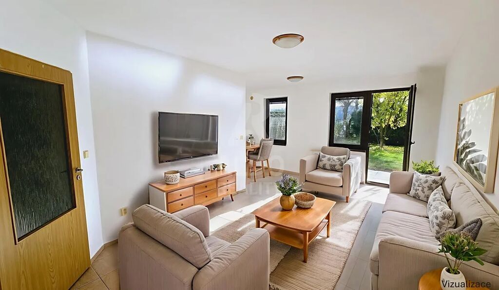 Bytová jednotka v přízemí domu má velikost cca 55 m2, je o dispozici 2+kk, francouzské okno na zahradu, koupelna se sprchovým koutem, komora.