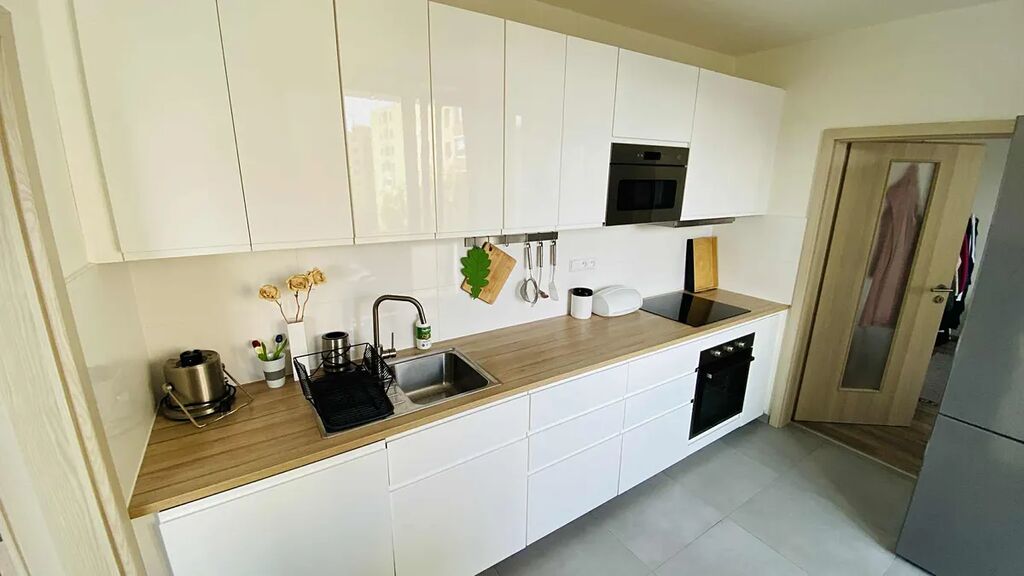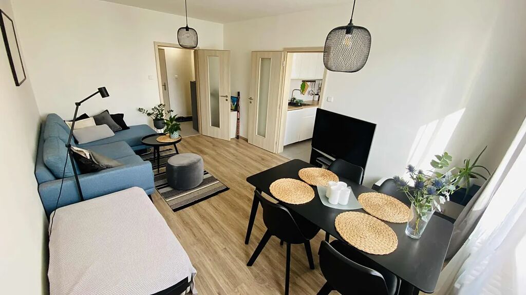 V celém bytě jsou komplet nové plovoucí podlahy, nové vnitřní obložkové zárubně a dveře, vyspravené omítky, komplet nový rozvod elektřiny, vody a odpady, klimatizace je umístěná v kuchyni a bez problému vychladí sousední ložnici a obývací pokoj.