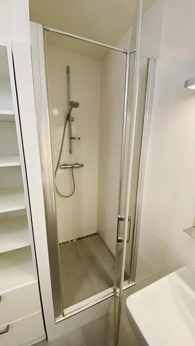 Koupelna je nyní s velkým sprchovým koutem, umyvadlem a vestavěnou policovou skříní. WC je samostatné s umyvadlem a místem pro pračku a sušičku.