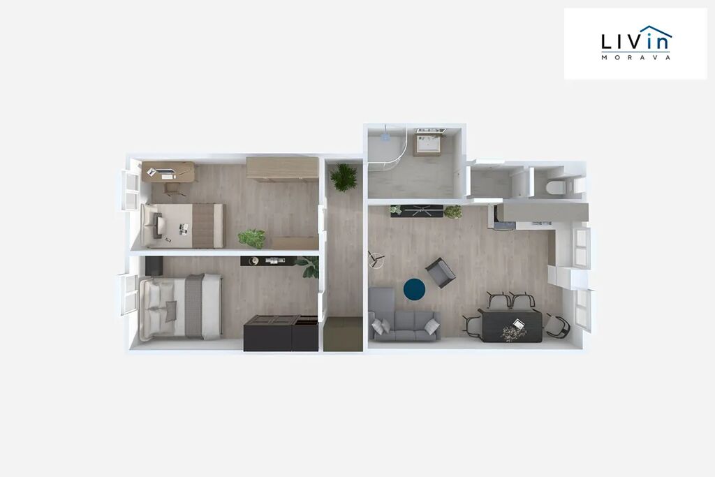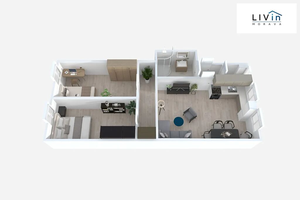 Dispozici bytu tvoří zádveří (1,5 m²), obývací pokoj s kuchyňským koutem (20,8 m²), chodba (5 m²), dva pokoje (po 10,6 m²), koupelna se sprchovým koutem (4,6 m²) a samostatné WC (1 m²). Pokoje jsou orientovány na sever do ulice, zatímco obývací pokoj s kuchyní směřuje na jih do vnitrobloku s výhledem do zeleně.