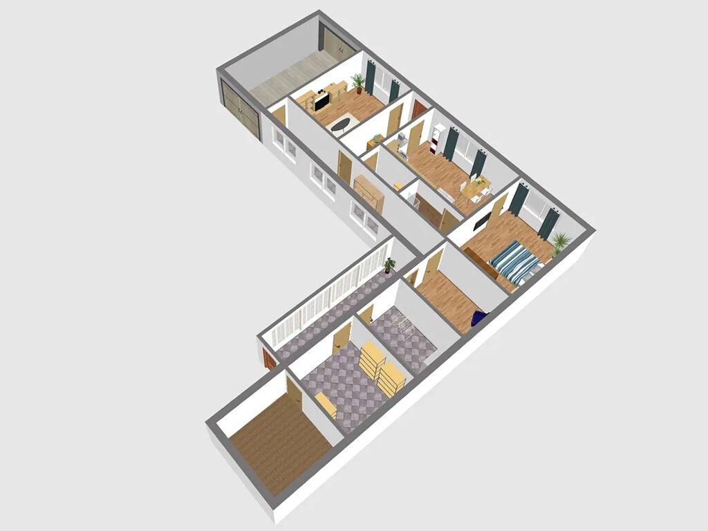 K hlavnímu vchodu domu vede malá oplocená předzahrádka. Po vstupu do chodby se vpravo nachází pokoj o výměře 20,6 m², vlevo kuchyně o velikosti 17,1 m². Z kuchyně je přístup do koupelny (3,66 m²), případně lze pokračovat do ložnice (20,6 m²). Chodbou projdete na prostornou prosklenou verandu (23 m²) s výhledem do dvora. Z verandy vedou dveře vpravo do průjezdu, vlevo pak do druhého, zastavěného křídla domu. To tvoří tři technické místnosti propojené prosklenou chodbou: první (12,2 m²), pravděpodobně využívaná ke zpracování masa, druhá (7,4 m²) s původním plynovým kotlem a třetí (13 m²) sloužila jako sklad. Na konci chodby se nachází samostatné WC (1,5 m²). Odtud se dále prochází na dvůr, kde se nachází chlév (12,6 m²) a prostorná zastřešená kůlna s udírnou.