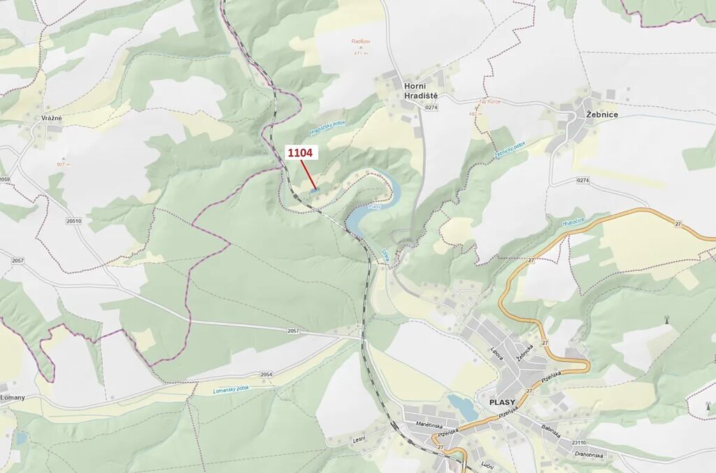 Lesní pozemek o výměře 1489 m2, parcelní číslo 1104, podíl 1/1, katastrální území Horní Hradiště, obec Plasy, obec s rozšířenou působností Kralovice, okres Plzeň-sever, Plzeňský kraj.