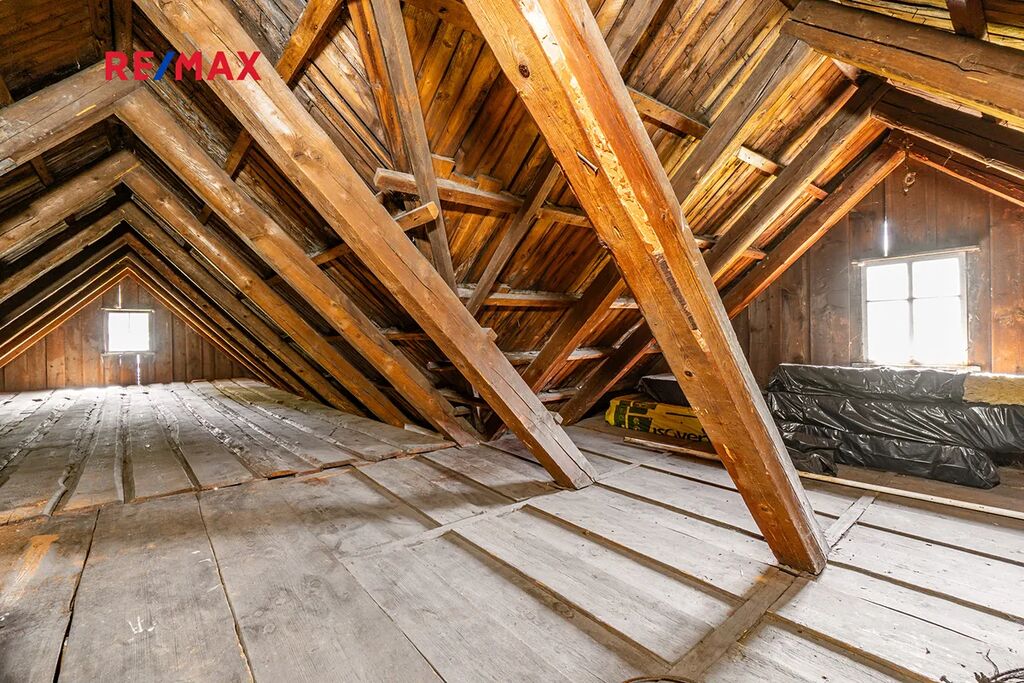 • Chalupa má suchý půdní prostor, zdravý krov a dobrou plechovou střechu.