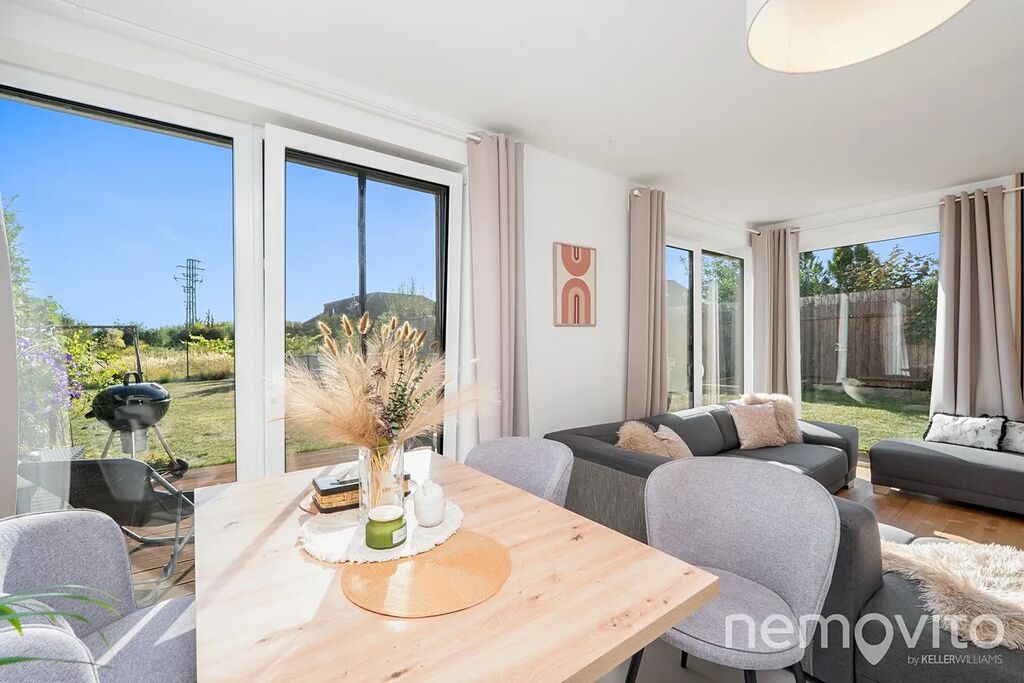 Hlavní obytný prostor s velkými okny do zahrady má rovných 40 m2 a pojí v sobě velkou kuchyni, obývák a prostor na plnohodnotnou jídelnu. Pod příjemnou dřevěnou podlahou je podlahové topení, přičemž roční spotřeba se pohybuje do úrovně 14 MWh plynu. Skvělým bonusem je samostatná prádelna/technická místnost, která má vstup z obýváku i ze zahrady a její velikost je 7 m2. Prádelnu pak doplňují ještě dvě komory - jedna nahoře a jedna dole.