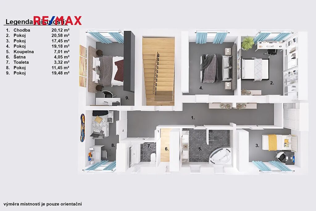 Díky své velikosti je ideálním řešením pro početnější rodinu. Nabízí krásné a komfortní zázemí. Aktuálně jsou plně obytná dvě podlaží, takže dům okamžitě poskytne pohodlí celé domácnosti. Orientační výměry jednotlivých místností jsou zmíněné v přiložených půdorysech. Spolu s tím Vám doporučujeme projít si nemovitost za pomoci 3D virtuální prohlídky, která Vám dopomůže k plné představě o rozložení jednotlivých místností.