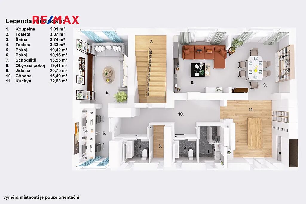 Díky své velikosti je ideálním řešením pro početnější rodinu. Nabízí krásné a komfortní zázemí. Aktuálně jsou plně obytná dvě podlaží, takže dům okamžitě poskytne pohodlí celé domácnosti. Orientační výměry jednotlivých místností jsou zmíněné v přiložených půdorysech. Spolu s tím Vám doporučujeme projít si nemovitost za pomoci 3D virtuální prohlídky, která Vám dopomůže k plné představě o rozložení jednotlivých místností.