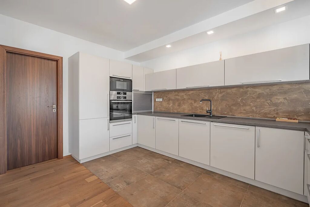 Kuchyň je plně vybavená vestavěnými spotřebiči a navržena v moderním stylu s důrazem na funkčnost a estetiku.