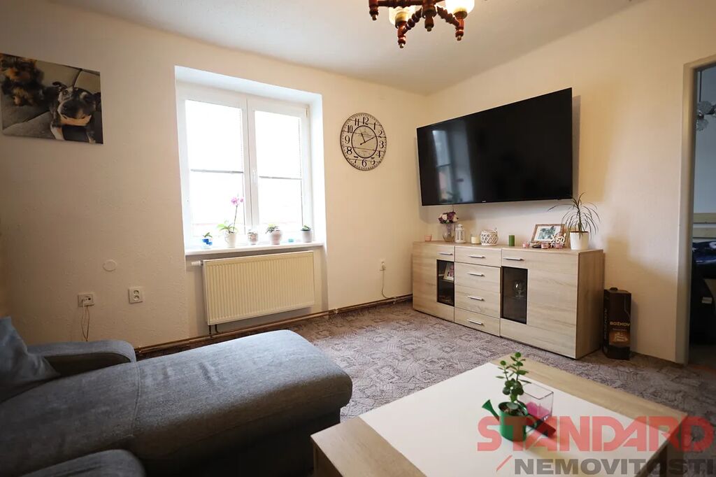 • Podlahy: dlažba (chodba, koupelna, WC), lino (kuchyně), koberec (obývací pokoj, ložnice).