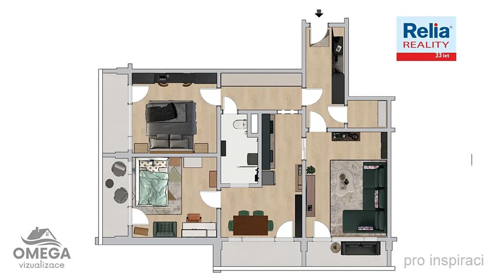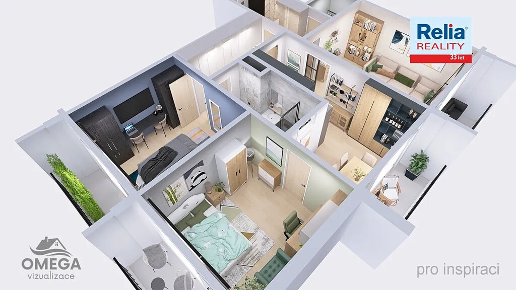 Celková plocha bytu činí téměř 90 m², což zahrnuje užitnou bytovou plochu 73 m², čtyři lodžie o celkové výměře 15 m² a sklepní kóji. Každý ze tří samostatných pokojů má svou vlastní lodžii. Dokonce i prostorná kuchyně s jídelnou má lodžii, která umožní rozšíření jídelny o romantické venkovní posezení. Zasklením lodžií si můžete prodloužit sezónu jejich užívání o další měsíce. Dispozice zajišťuje dostatek soukromí pro všechny členy domácnosti. V bytě je navíc samostatná komora a v suterénu sklepní kóje.