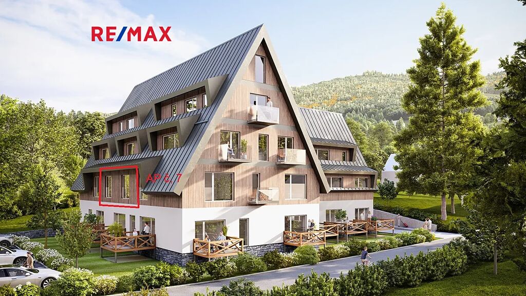 Prezentovaný apartmán č. 7 o dispozici 2+KK se nachází v prvním patře (2 NP) a disponuje celkovou podlahovou plochou 42,3 m². K jednotce náleží náleží privátní uzamykatelná kolárna + lyžárna (2,5m2), parkovací stání a možnost využívat společného wellness.