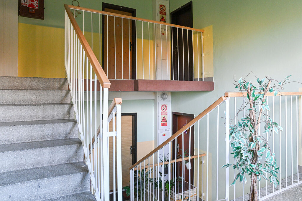 Nachází se ve 3. patře nízké třípatrové zástavby, obklopené zelení a klidem.