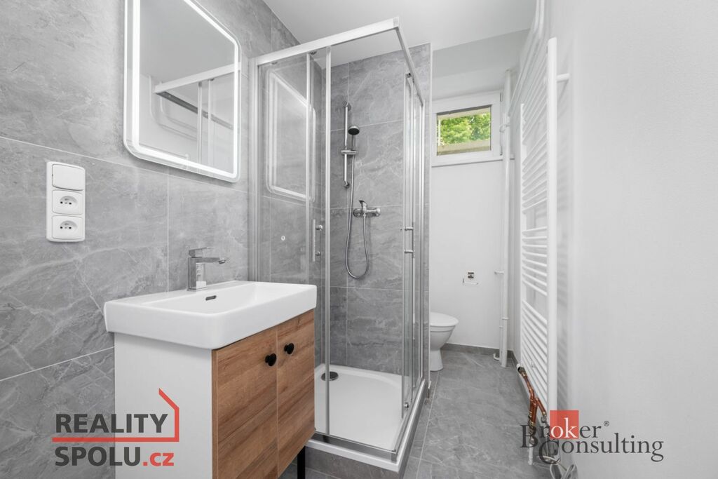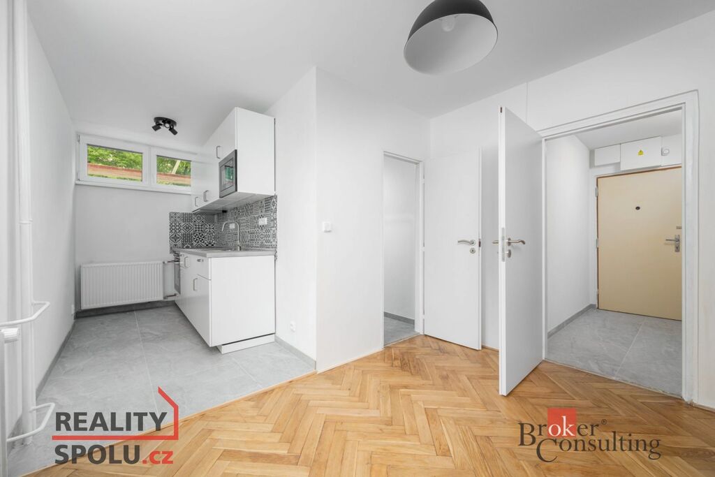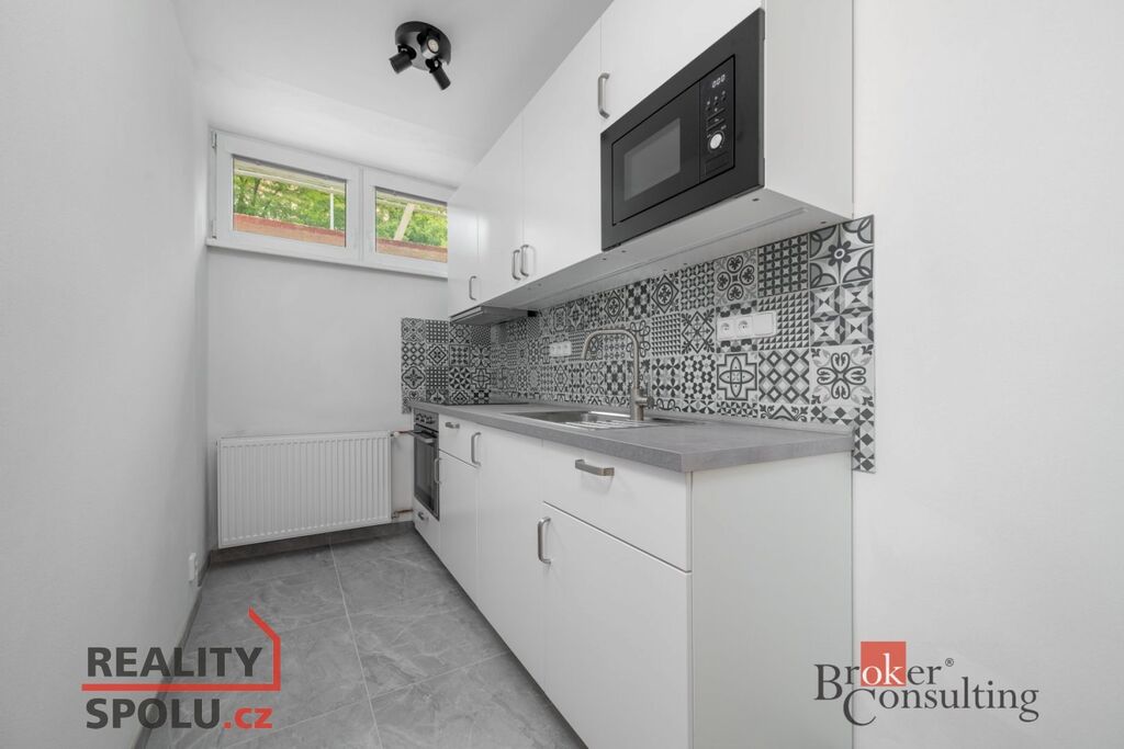 V bytě je nová kuchyňská linka s mikrovlnou a horkovzdušnou troubou, sporák a moderní koupelna, jejíž součástí je WC a sprchový kout.
