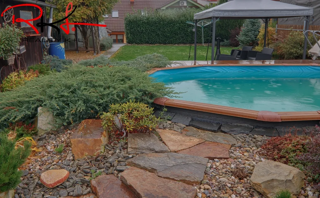• na pozemku kolna, skleník, venkovní krytá kuchyně, bazén, pergola, okrasné traviny a dřeviny