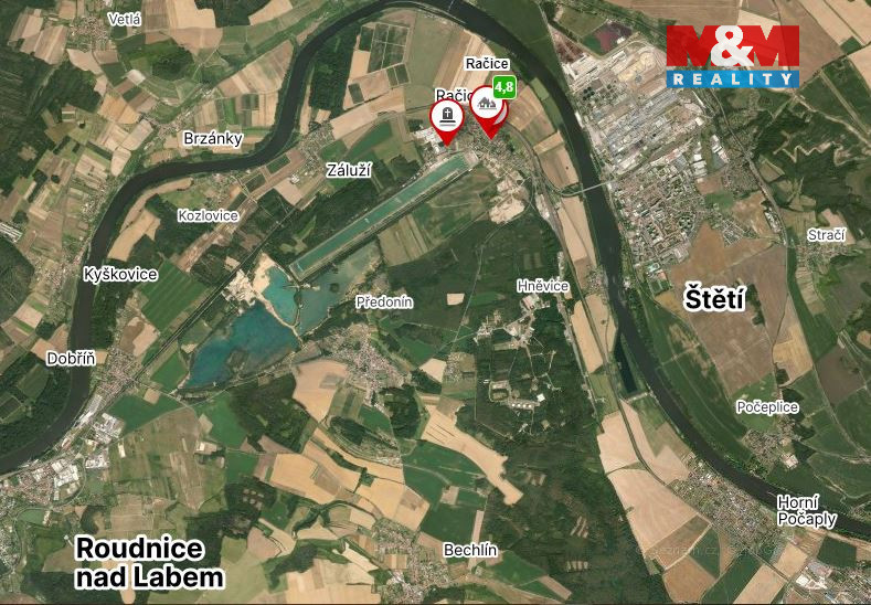 Prodej zasíťovaného pozemku v obci Račice. Pro tento pozemek rezervovány kapacity na připojení na vodovod a kanalizaci. Sousedství veslařského kanálu, který byl zpřístupněn pro veřejnost. Možnost rekreačních aktivit jako je koupání, opalování, trénink, hřiště, tělocvičny, posilovny, hotel, sauna. Račický areál je zároveň i rybářským revírem. Okolo závodní trati a vratného kanálu je 5 kilometrů dlouhá asfaltová silnice bez dopravy, oblíbená zejména in-line bruslaři, cyklistická stezka, stezka pro chodce. Nedaleko je vyhledávaná zatopená pískovna. Regulativa - plochy bydlení v rodinných domech (BI) - výška hlavního objektu nepřekročí 2,0 NP, tj. přízemí s obytným podkrovím při respektování okolní výškové hladiny, zastavitelnost pozemků max. 30 %. Je možný výběr z dalších 3 prostředních parcel o výměrách 903 až 1099 m2. Veškerá občanská vybavenost ve 4 km vzdáleném Štětí. Praha 44 minut, Mělník 19 minut, Roudnice nad Labem 11 minut. Více info u makléře