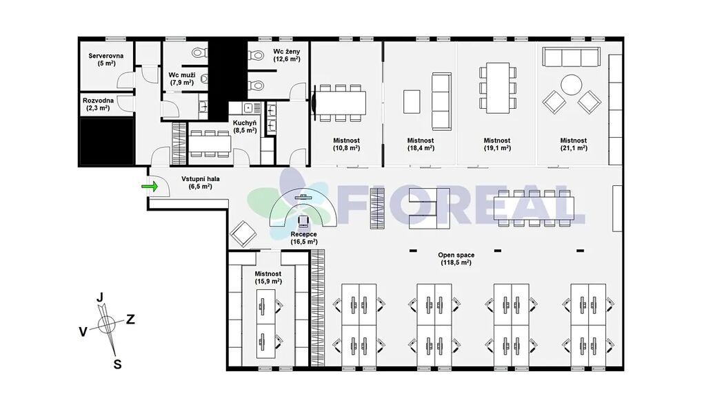 Prostor je plně klimatizován, zasíťován datovými rozvody s vysokorychlostním internetem a je rozdělen do několika částí. Konkrétně disponuje třemi zasedacími místnostmi z nichž dvě se používají ke konferencím, dvěma samostatnými kancelářemi a jedním centrálním prostorem typu openspace, dále recepcí, kuchyňkou, toaletami i technickým zázemím.