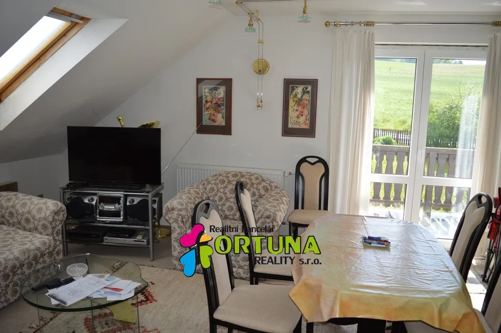 Rodinný dům je podsklepený, v prvním nadzemním podlaží je byt o dispozici 3+1 s vlastní terasou, koupelnou. Byt je vytápěný plynovým kotlem, v obývacím pokoji jsou také krbová kamna.