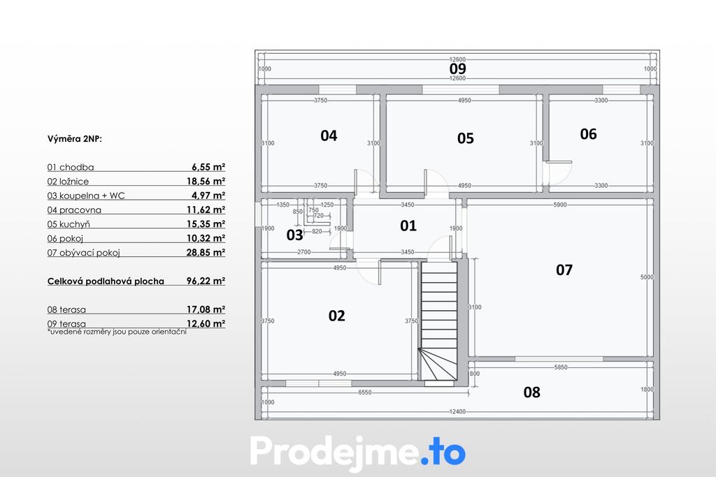 V patře se nachází druhá jednotka 4+1 o výměře 96 m2 – kuchyň, obývací pokoj, ložnice, dva pokoje, koupelna, samostatné WC a dva prostorné balkony s výhledem do okolí.