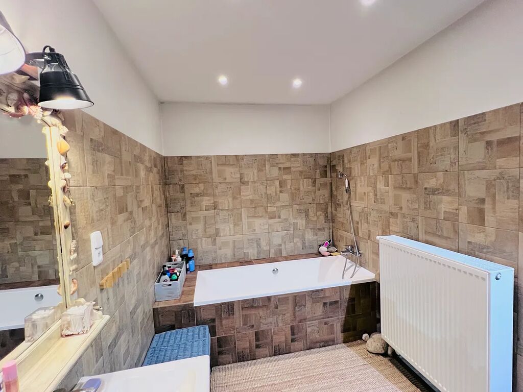 Aktuálním srdcem domu je kuchyň s jídelnou, vybavena zakázkovým koutem se spotřebiči značky Gorenje a Elektrolux, která plynule přechází v opravdu prostorný obývací pokoj s několika okny a hezkým výhledem na okolí. Tomuto hlavnímu pokoji kralují industriální krbová kamna AquaFlam o výkonu 25Kw, které mají na starosti spolu s elektrokotlem Trinnity teplotní komfort majitelů nemovitosti v zimním období roku. Z hlavní chodby se dostaneme dále jednak do krásně prostorné koupelny se zděným sprchovým koutem a velikou vanou, ale i do spojovací haly, která nás zavede do třech samostaných ložnic a pracovny. Na podlahách pokojů v této obytné části domu je položen kvalitní zátěžový vinil s dekorem dubu, v chodbách a koupelně je dlažba.