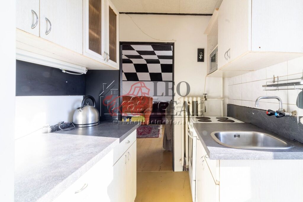 Za vstupními dveřmi do bytu se nachází kuchyně, ve které je umístěn nový sprchový kout. Kuchyň je vybavena starší kuchyňskou linkou s kombinovanou elektrickou troubou a elektrickými varnými plotýnkami. K dispozici je také rychlovarná konvice a mikrovlnná trouba.
