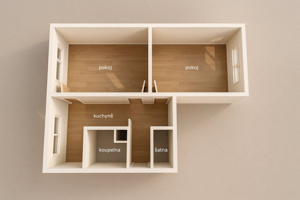 Velkou výhodou je dispozice – jeden z pokojů má dvoje dveře, takže je možné tuto místnost jednoduše rozdělit a vytvořit další samostatný pokoj, čímž lze byt upravit na menší 3+1.