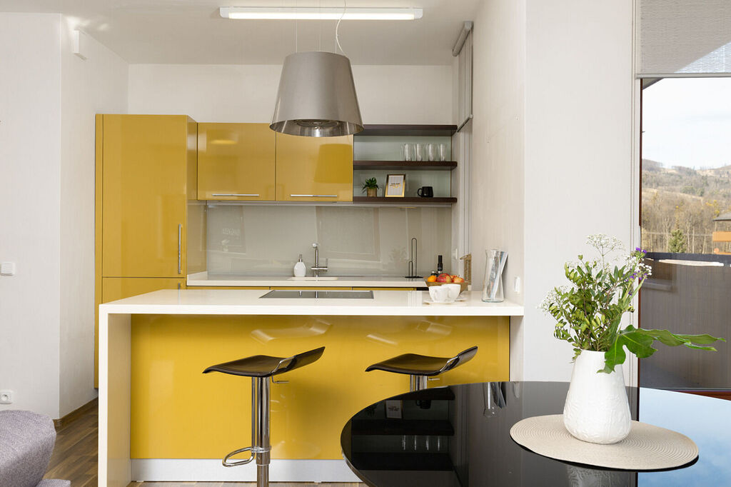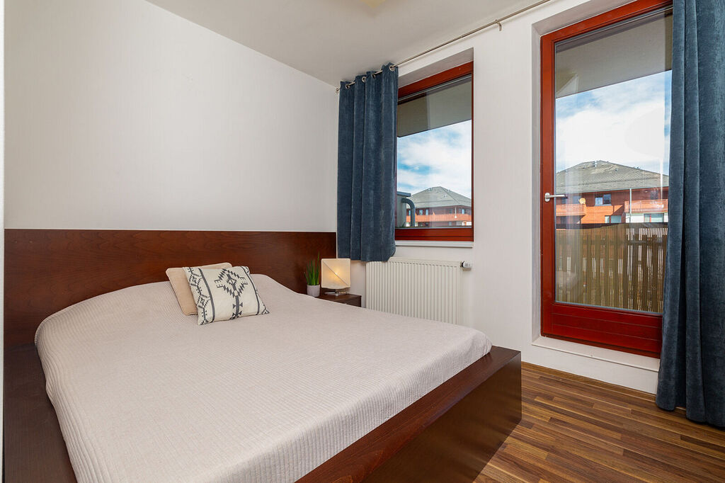 Hned při vstupu do bytu se nachází chodba s vestavěnou skříní, která nabízí dostatek úložného prostoru. Koupelna je vybavená sprchovým koutem, toaletou, umyvadlem s uloženým prostorem a pračkou. Ložnice je disponuje manželskou postelí, komodou, nočními stolky a má přímý vstup na terasu. Hlavní obytný prostor je otevřený a propojuje kuchyňský kout, jídelnu a obývací pokoj. Kuchyňská linka je moderně vybavena troubou, indukční varnou deskou, designovou digestoří, mikrovlnnou troubou a myčkou. V obývací části najdete pohodlnou sedací soupravu, TV stolek, konferenční stolek, komody a jídelní stůl se židlemi. Z této místnosti je rovněž přístup na prostornou terasu s venkovním posezením, která je průchozí i do ložnice.