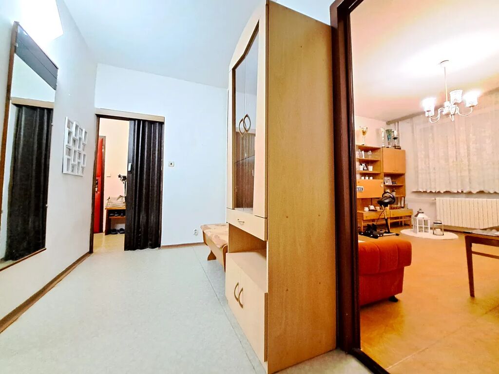 Dispoziční řešení: vstupní chodba s komorou, velká chodba se zrcadlem a skříněmi, koupelna s vanou, umyvadlem a pračkou, samostatné WC, prostorný obývací pokoj, ze kterého je vstup do ložnice, samostatný pokoj, dále kuchyň, vedle které se nachází menší pokoj. K bytu patří sklep. V bytě jsou nová okna a stupačky, jinak je v původním udržovaném stavu. Bytový dům prošel revitalizací ( nová fasáda včetně zateplení, vstupy, výtah, rozvody atd.).