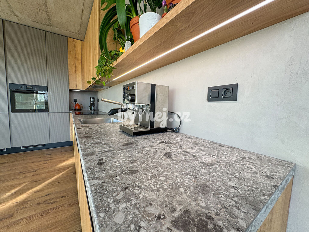 - kuchyňská linka na míru se všemi vestavnými spotřebiči (myčka, trouba, varná deska, digestoř, lednice s mrazákem)
