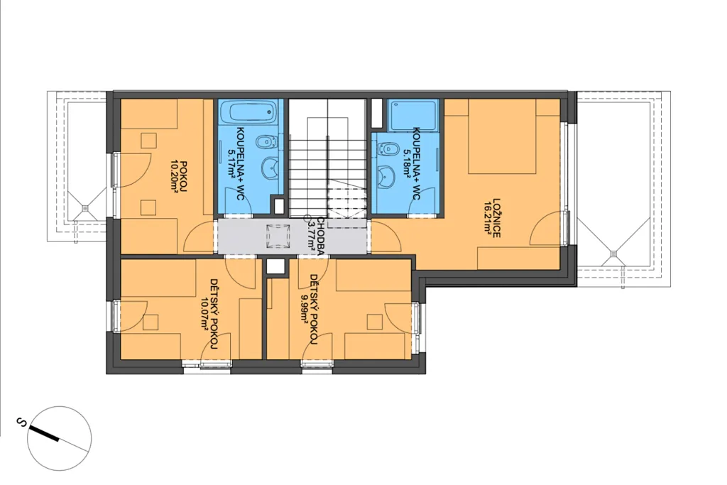 V přízemí se nachází velkorysý obývací pokoj s kuchyní (33,5 m²) a vstupem na terasu (17,2 m²), technická místnost, koupelna se sprchou a WC a garáž pro jeden vůz. Parkování je zajištěno i před domem. V patře je hlavní ložnice (16,8 m²), dvě dětské ložnice (10,8 a 10,7 m²), pracovna (10 m²) a dvě koupelny – jedna se sprchovým koutem a WC, druhá s vanou a WC.