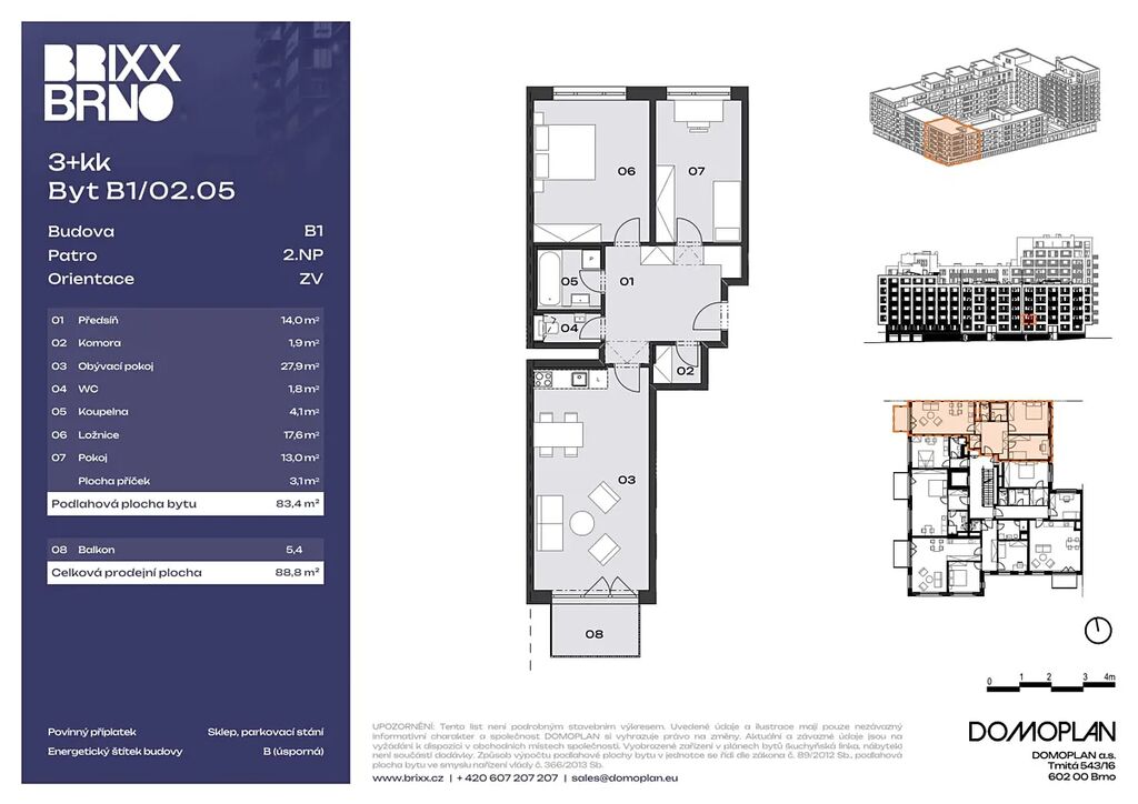 Nabízíme vám ke koupi bytovou jednotku B1/02.05 o dispozici 3+kk s balkonem v rámci nového projektu BRIXX od DOMOPLANu.