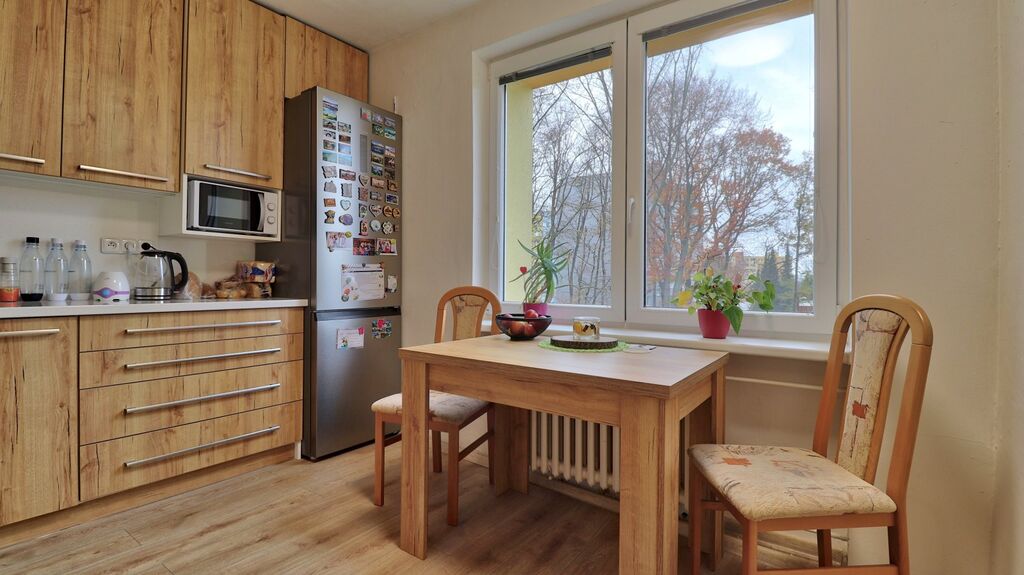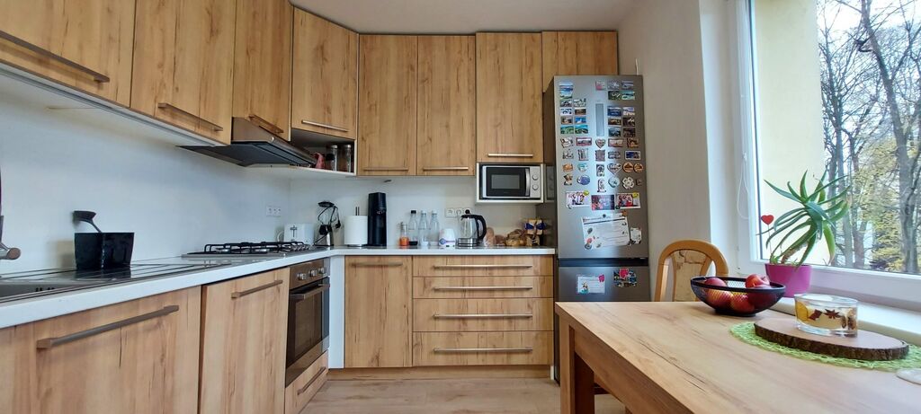 Kuchyně je vybavena kuchyňskou linkou se spotřebiči, byt lze po dohodě pronajmout s vybavením nebo bez něj. Parkování je možné v okolí domu.
