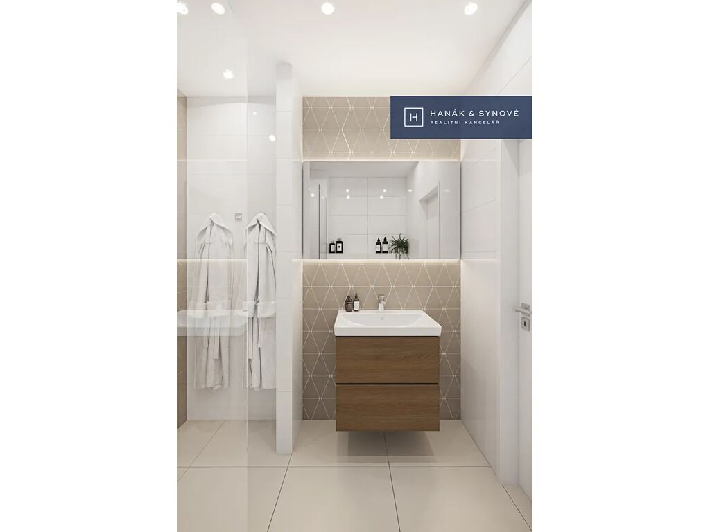 •Koupelna s velkorysým walk-in sprchový koutem se skleněnou stěnou Hüppe a podlahovým nerezovým žlabem je dále vybavena umyvadlovou a podsvíceným zrcadlem, sanitární keramikou značky Villeroy&Boch, chromovou umyvadlovou i sprchovou baterii Hansgrohe. Celkovou atmosféru dotváří rafinované nasvícení pomocí zapuštěných podhledových světel a led pásků.