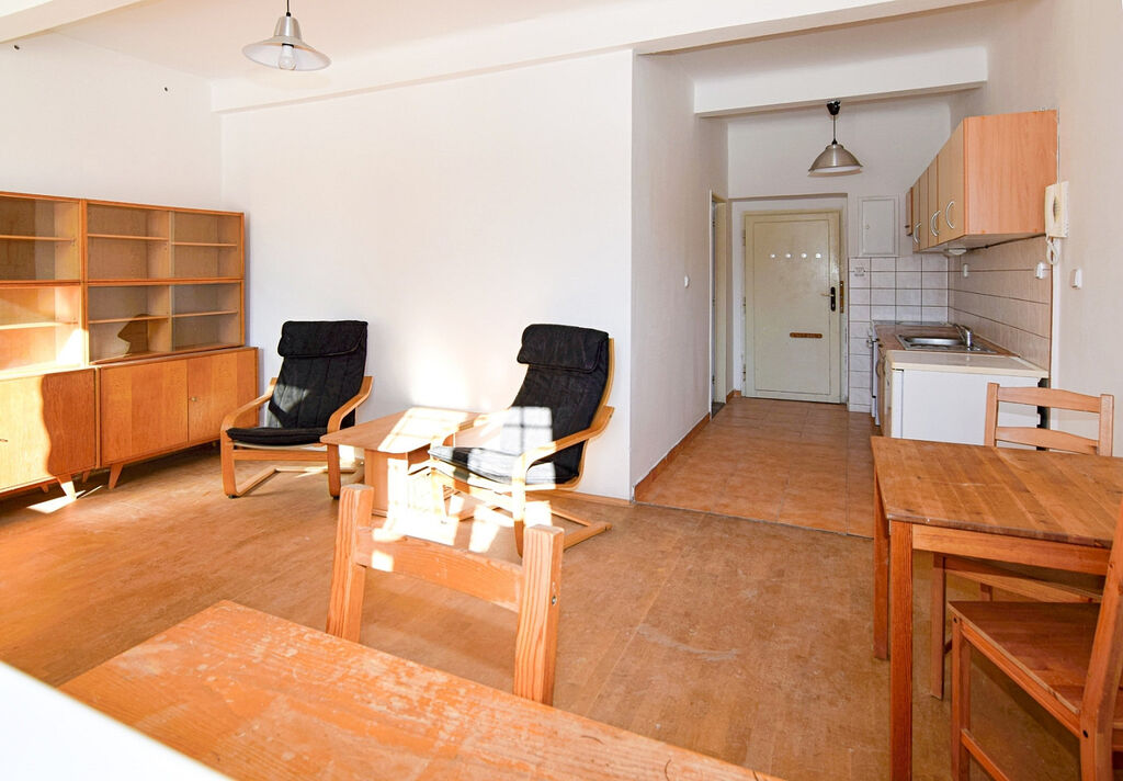 Disponuje prosvětlenou hlavní místností s kuchyňským koutem do tvaru L.