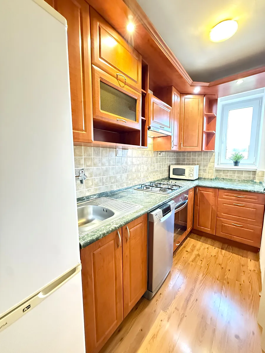 Dispozici bytu tvoří hlavní obytný prostor, ložnice a dětský pokoj/pracovna, dále vybavená kuchyně s kuchyňskou linkou a dostatkem úložných prostor, lednicí s mrazákem, vestavnou troubou, plynovým sporákem, myčkou, dřezem, digestoří a mikrovlnnou troubou. Koupelna je osazena vanou, umyvadlem se skříňkou a zrcadlem; toaleta je samostatná průchozí přes koupelnu a má okno. Ve vstupní hale je zrcadlo a věšáková stěna. K bytu náleží dva velmi praktické sklepy s okny (jeden zděný s regály a jedna dřevěná sklepní kóje), v domě je společná kolárna a za domem zahrada s pískovištěm a místem k odpočinku.