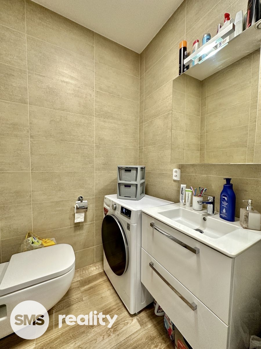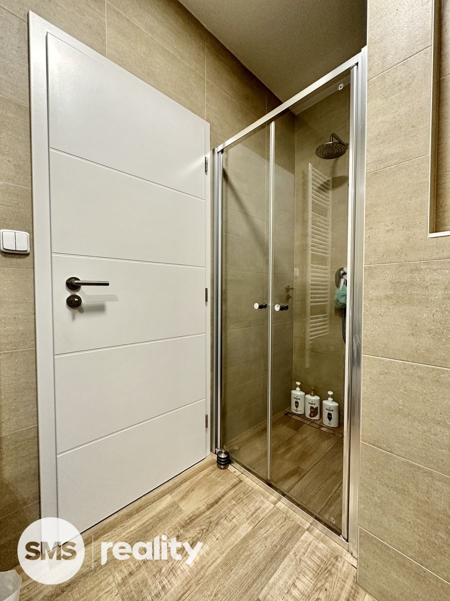 Při vstupu do bytu vás přivítá chodba s vestavěnou skříní, která poskytuje dostatek úložného prostoru pro vaše věci. Odtud také vcházíte do moderně zařízené koupelny, která disponuje sprchovým koutem, umyvadlem a toaletou, abyste si mohli užívat veškerého komfortu.