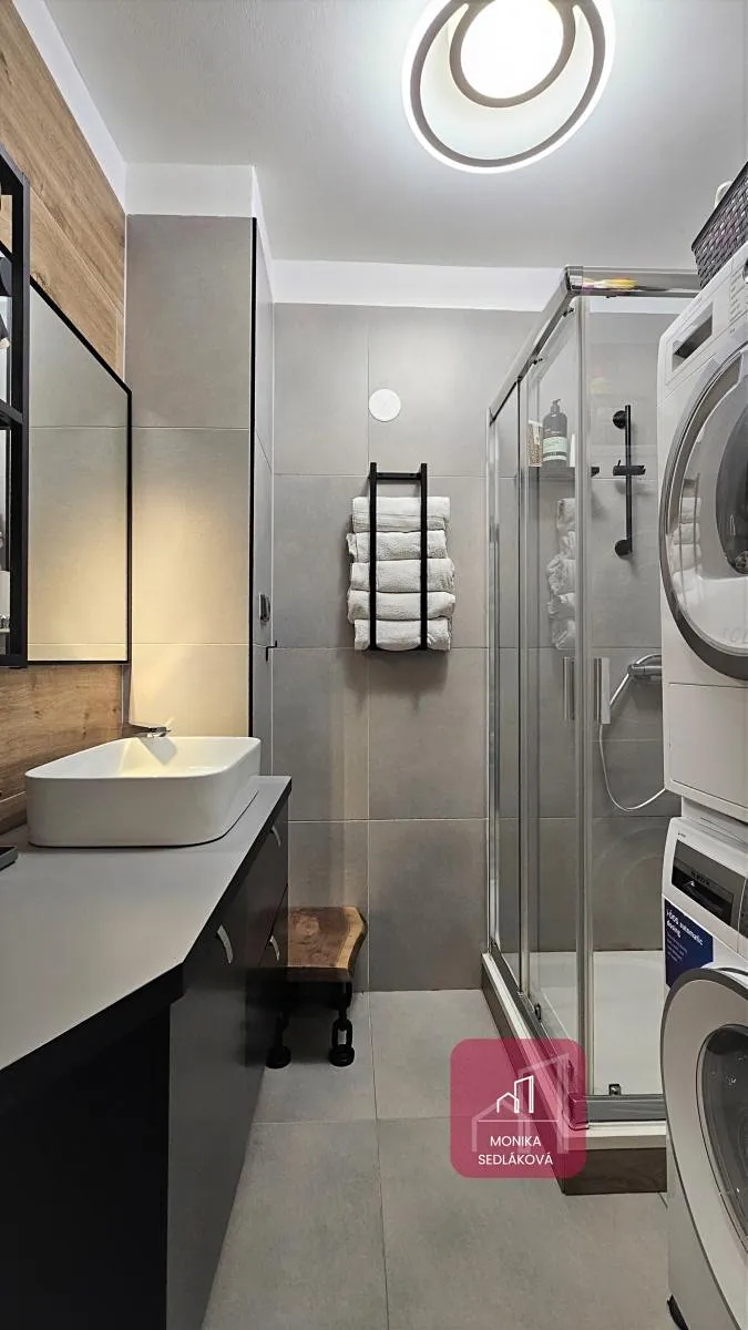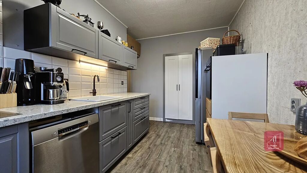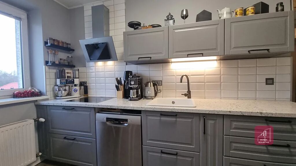 Rekonstrukce bytu proběhala postupně (nové rozvody elektřiny, nová kuchyňská linka s vestavěnými spotřebiči indukční varná deska, myška, dřez, odsavač par, el. trouba). Koupelna se sprchovým koutem, umyvadlem, otopným žebříkem a vývody na pračku a sušičku, samostatná toaleta, nový el. bojler je umístěný na půdě.