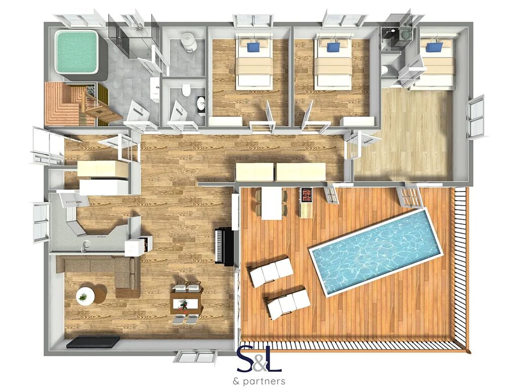 Prostorné a světlé místnosti poskytují dostatek místa pro každodenní činnosti i relaxaci. Z hlavních obytných místností a terasy se nabízí dechberoucí výhled do okolní krajiny. V létě jistě oceníte bazén na terase, který je perfektním místem pro odpočinek a zábavu.