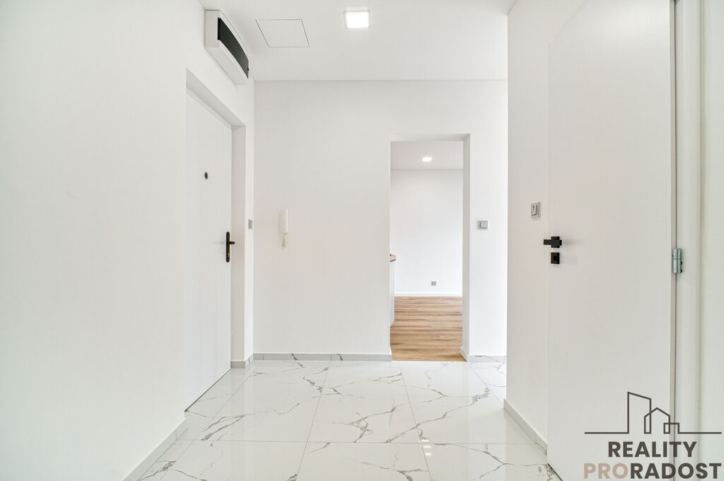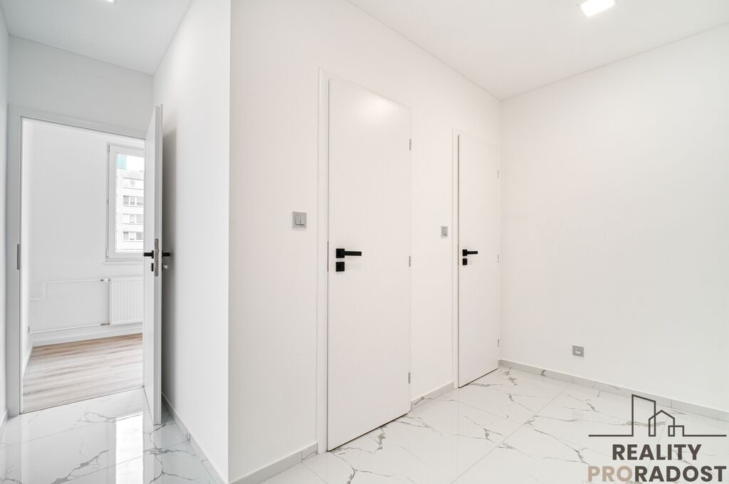 Kompletní rekonstrukce zahrnovala – celkovou změnu dispozice, novou elektroinstalaci včetně nového rozvaděče (vše má svůj vlastní okruh), vyzdění nového bytového jádra, kompletní rekonstrukci rozvodů vody, vytvoření ventilace, SDK podhledů, aplikaci keramické velkoformátové dlažby, instalaci sanity. Dále sjednocení nášlapových vrstev podlah v celém prostoru, aplikace sádrové omítky a výmalbu, instalace LED osvětlení, vypínačů a zásuvek ABB, instalaci voděodolné vinylové podlahy a keramické dlažby do chodby, koupelny a na toaletu, instalace interiérových dveří včetně kování v černé barvě a protipožárních vstupních dveří a dále instalace kuchyňské linky včetně spotřebičů.