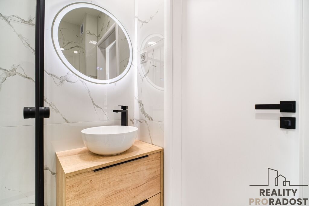 V koupelně se nachází sprcha, koupelnová skříňka vytvořená na míru ve stejném dekoru jako kuchyňská linka, zrcadlo s LED osvětlením a příprava na pračku a sušičku.