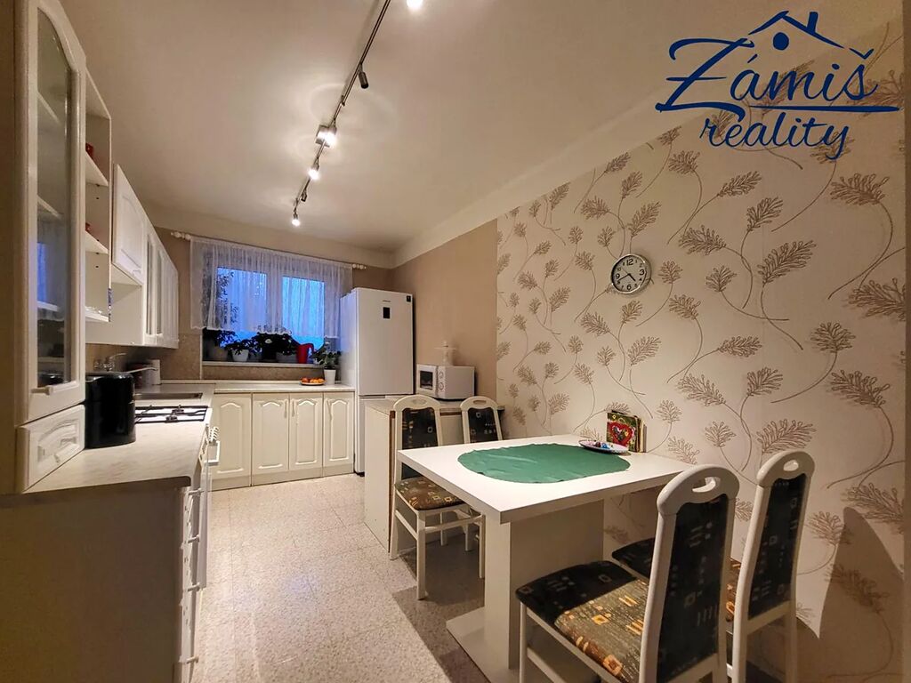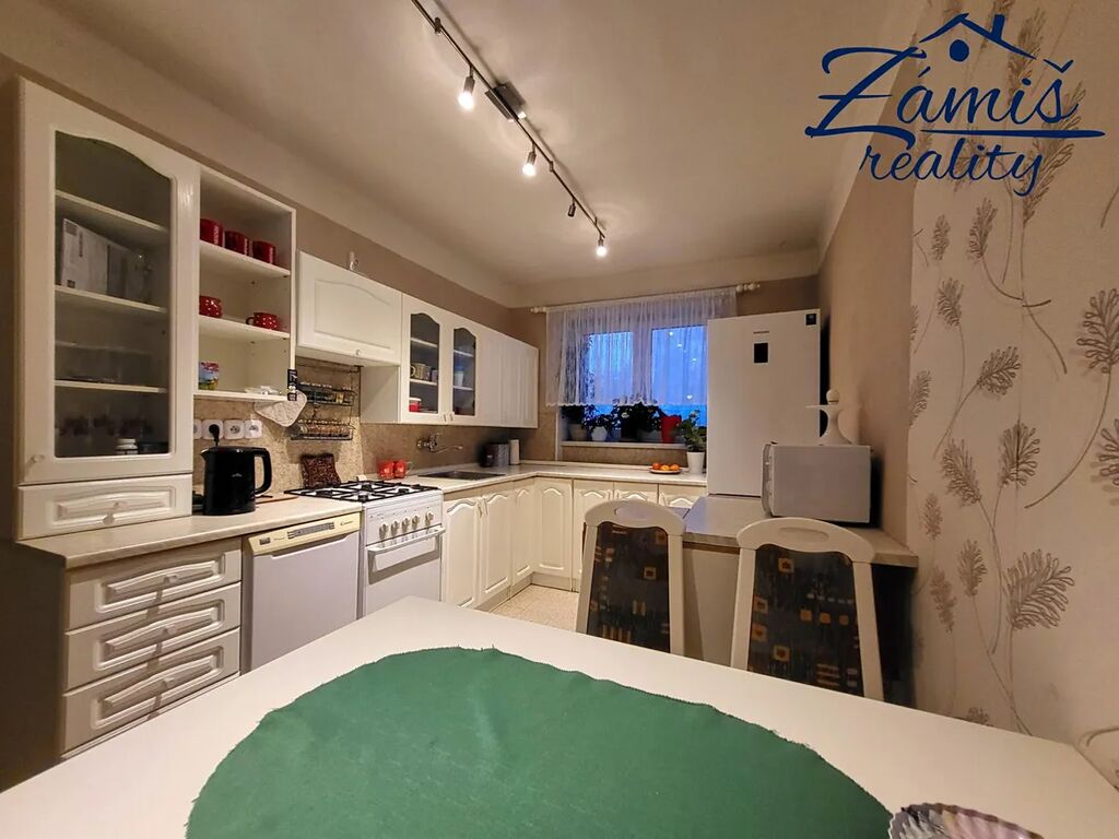 Velmi pěkný a prostorný byt vybavený kuchyňskou linkou s myčkou a jídelním stolem se židlemi, v koupelně je sprchový kout, umyvadlo, WC a prostor na pračku i sušičku.