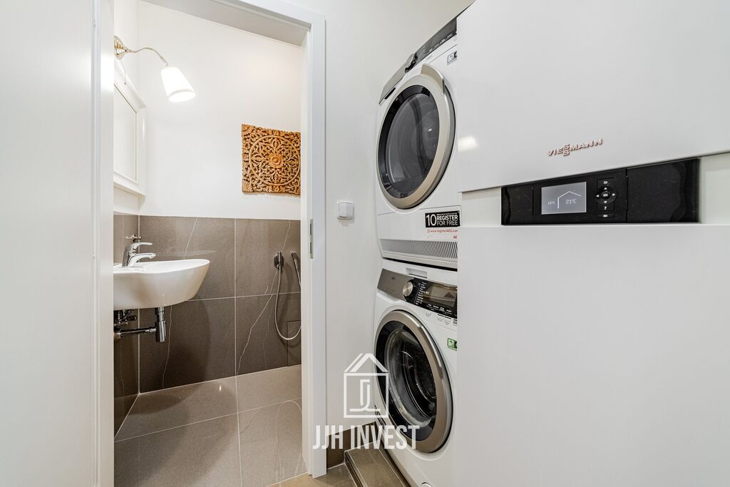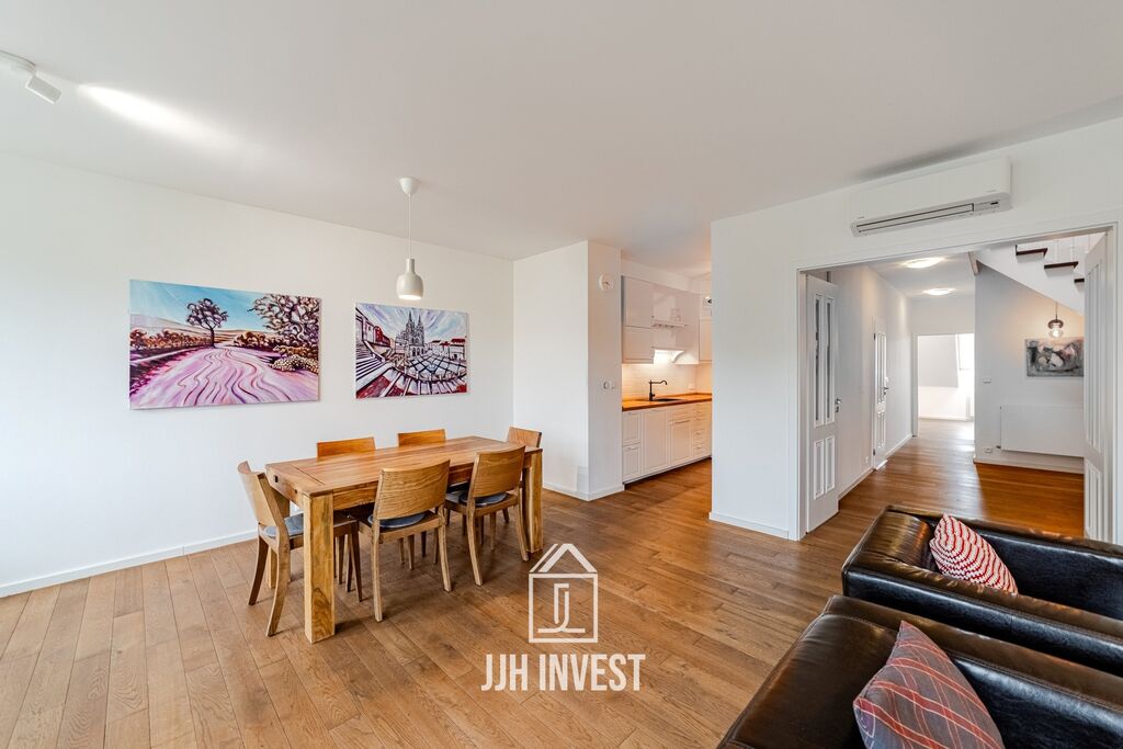V horním patře jsou umístěny dvě ložnice, druhá koupelna, praktická kuchyňka a otevřený kout vhodný pro home office, dětský herní prostor nebo relaxační zónu. Součástí vybavení je také sauna, která zpříjemní zimní dny a dodá bytu jedinečný charakter. Interiér je laděn do nadčasových tónů a doplněn o vestavný nábytek na míru i klimatizaci.