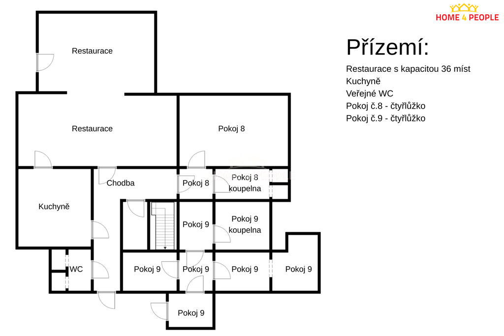 • Kapacita: 36 míst k sezení v interiéru + 16 míst na venkovní terase
