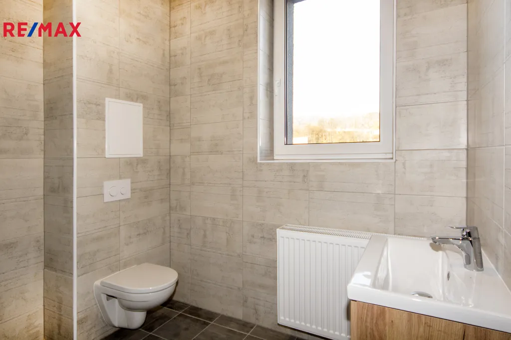 Moderně postavený dům je vytápěn pomocí tepelného čerpadla, rozvod tepla i teplé vody je ústřední.
