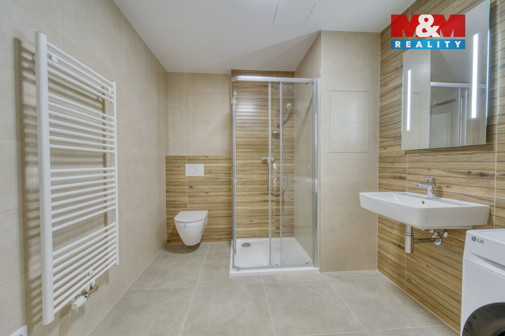 V bytě budete mít k dispozici velkorysou koupelnu se sprchovým koutem a pračkou, na kterou si můžete umístit i sušičku. V hlavní místnosti na vás čeká moderní kuchyňská linka s vestavěnými spotřebiči, včetně trouby, mikrovlnné trouby a lednice.