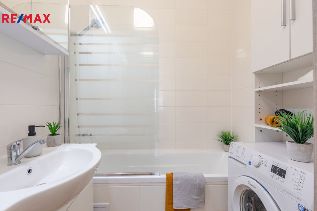 Byt zajišťuje nájemcům komfortní bydlení v příjemném interieru, velmi prostorná kuchyňská linka v praktickém tvaru do L s vestavnou varnou deskou, myčkou š. 60 cm, elektrickou troubou, digestoří, volně stojící MW troubou, zářivě bílá koupelna s podélnou vanou pro pohodlnou koupel, policemi pro ukládání toaletních potřeb s umístěním pračky, třídveřová šatní skříň s posuvnými dveřmi přes celou šířku ložnice, vestavná skříň v předsíni, na oknech žaluzie, podlahy - krásné masivní parkety v obou pokojích, v kuchyni a předsíni dlažba. Vše zánovní, čisťoučké, voňavé, ihned k nastěhování. Součástí pronájmu je sklepní kóje.