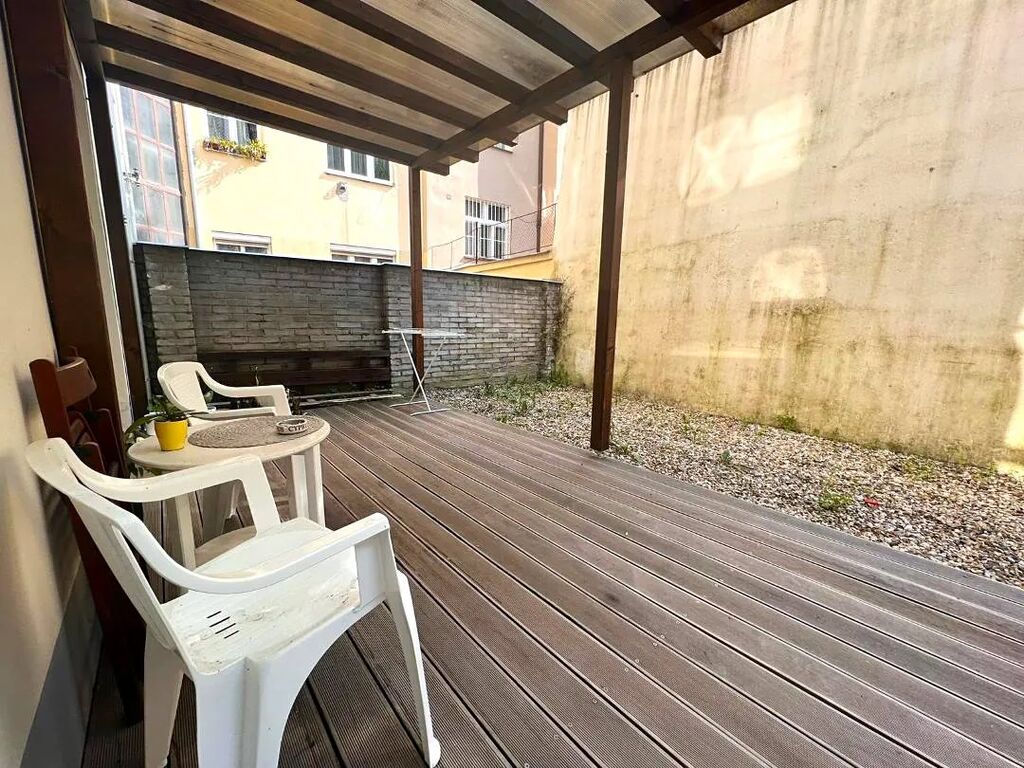 Na první pohled zaujme nápadité řešení interiéru, stejně jako jeho stylové provedení. Byt, jehož původní dispozice byla 1+kk, prošel velmi povedenou proměnou, kdy po zatažení posuvných panelů vzniká 2+kk nabízející obývací pokoj s kuchyňskou linkou a ložnici, kde díky vytvoření příčky z dnes již ikonických luxferů vznikl i prostor pro pracovnu s rozkládacím lůžkem. Dostatek úložného prostoru zajišťují mimo jiné vestavěné skříně v předsíni bytu, zde je umístěna i pračka. Koupelna je se sprchovým koutem a závěsným wc. Z obývací části i z ložnice lze po otevření francouzských oken vstoupit na terasu/zahrádku. Ta sice nenabízí dechberoucí výhledy, co ale i díky zastřešení terasové části nabízí, je pocit soukromý vybízející ke klidnému posezení.