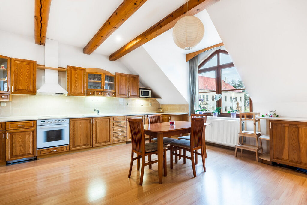 Byt je mezonetový o velikosti 4+KK po rekonstrukci a je velmi vzdušný a světlý. V celém bytě jsou dřevěné podlahy, vestavěný nábytek, prostorná kuchyňská linka s jídelním koutem propojeným s obývacím pokojem, dvě koupelny, velký dětský pokoj a dvě ložnice. Byt se nachází ve druhém patře cihlového domu. Parkování je zajištěno před domem.